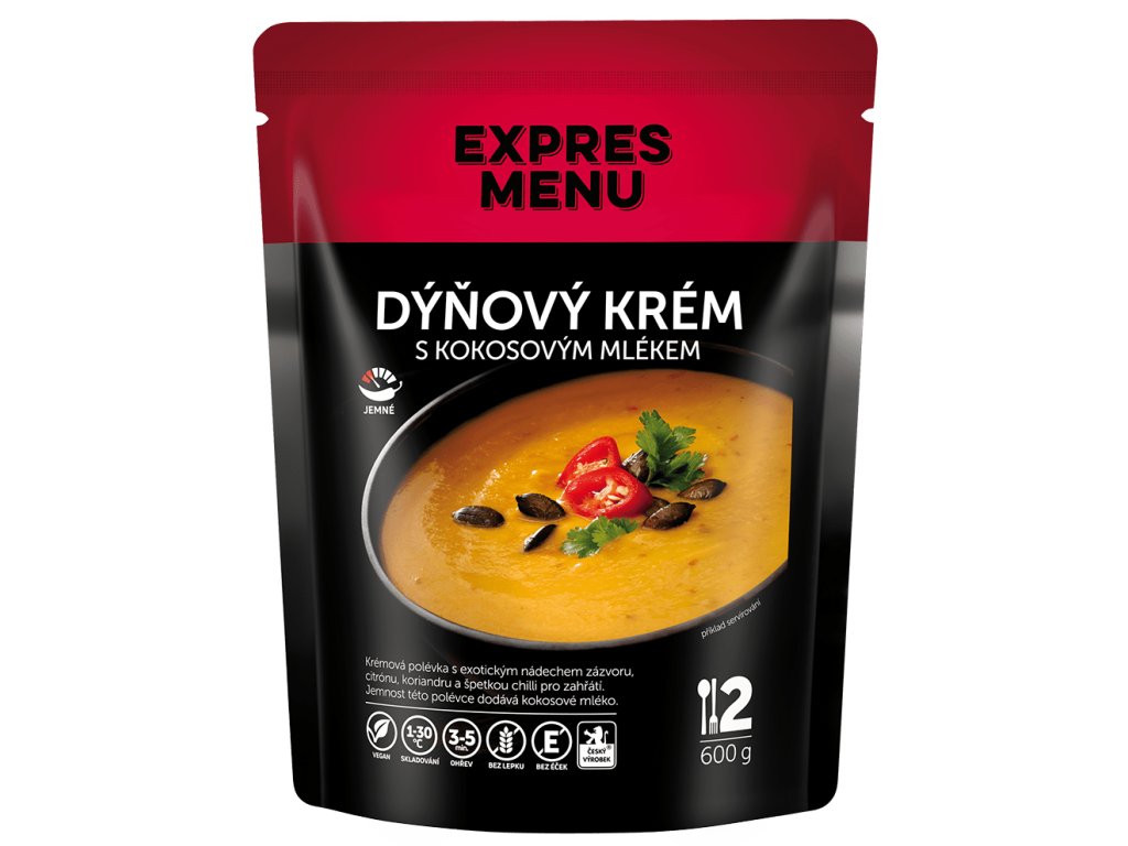 voda, dýně Hokaido (53%), kokosové mléko (9,7%), cibule, olivový olej, zázvor mletý, cukr, sůl, koriandr, chilli.