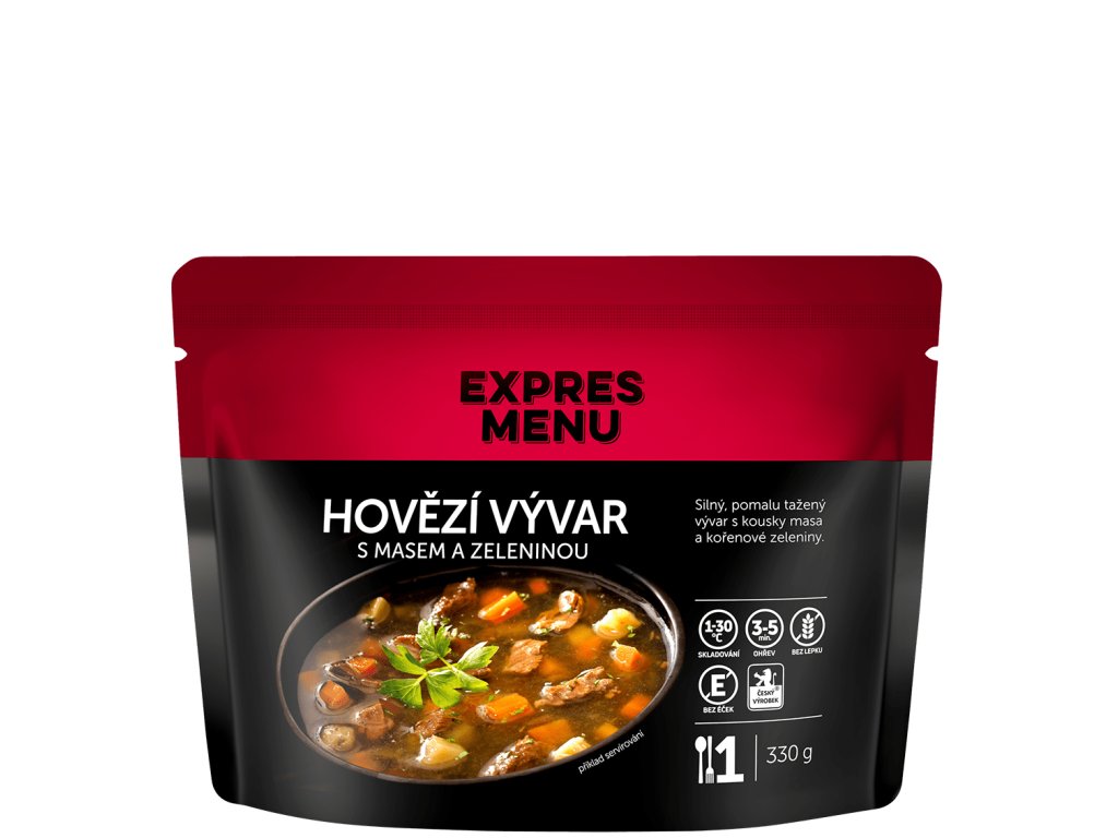 hovězí vývar (voda, hovězí maso a kosti, cibule, česnek, bobkový list, nové koření, pepř, sůl), směs zeleniny (mrkev, celer, petržel) (23 %), hovězí maso (15 %), sůl kamenná, pepř.