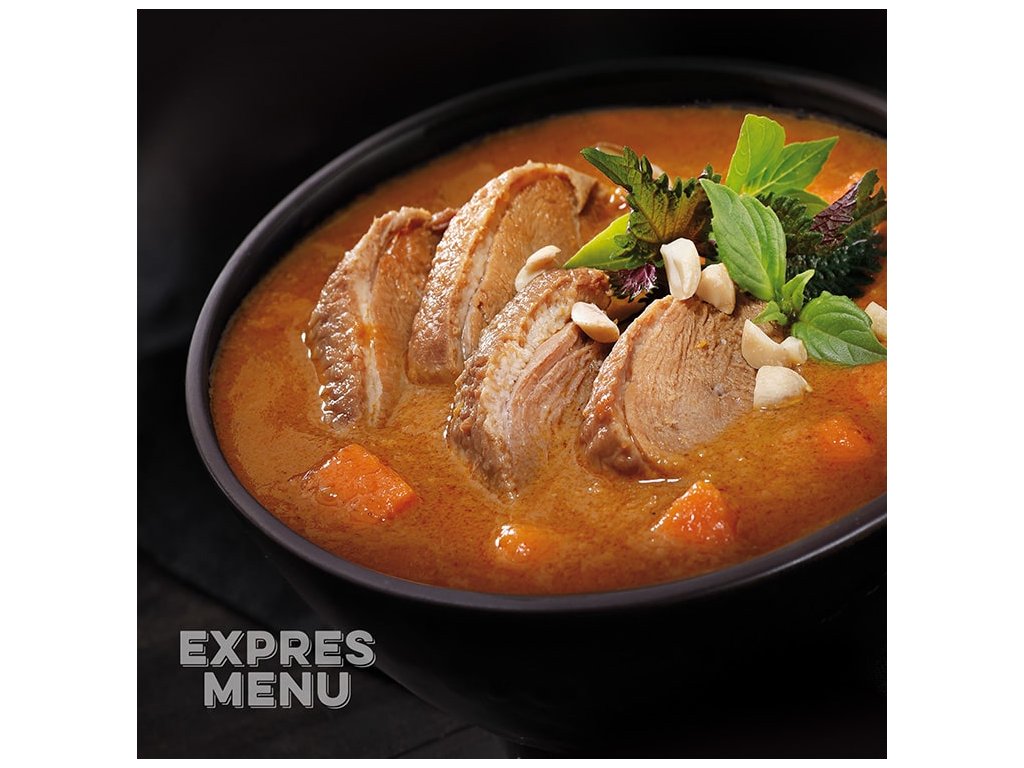 Křehká kachní prsa v jemně pálivém thajském kari s batáty, mrkví a kokosovým mlékem, dochucená tamarindovou a massaman pastou s vybranou směsí exotického koření.