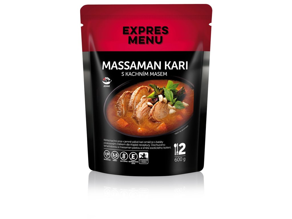 kachní prasa (33%), kokosové mléko(16%) (kokos, pitná voda), batáty(10,7%), mrkev(5,9%), červená cibule, arašídy, massaman kari pasta(2%)(chilli 20%, česnek, šalotka, jedlá sůl, citrónová tráva, kmín, koriandrová semena, galgán), kuřecí vývar(kuřecí kosti, pitná voda), rýžová mouka, kukuřičná mouka, rybí omáčka(1,5%)(extrakt ze sardele obecné(63 %), pitná voda, jedlá sůl, cukr), cukr třtinový, limetková šťáva, tamarind pasta(1%)(tamarind 96%, pitná voda, jedlá sůl), římský kmín, koriandr mletý, bobkový list, kardamon.