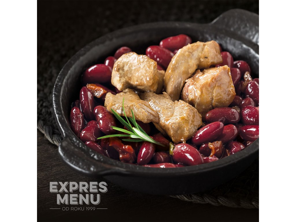 Šťavnaté vepřové maso s fazolemi, které jsou dušené na základu z cibule, rajčat a paprik.