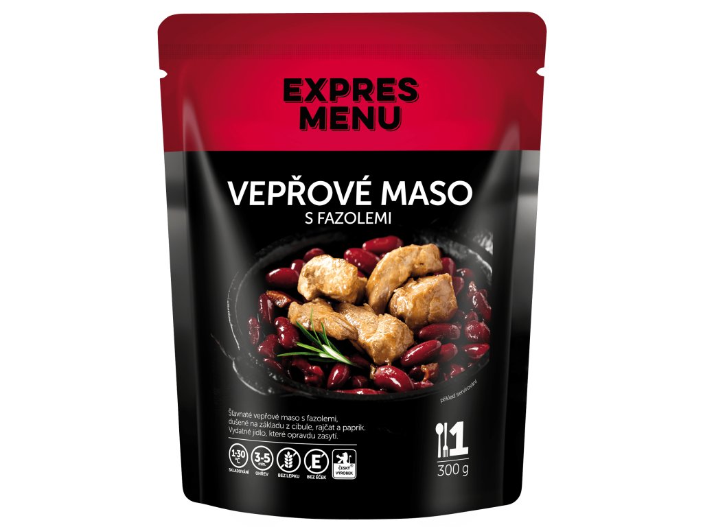fazole černé (50 %), vepřové maso plec (25 %), lečo (rajčata, papriky, cibule) (23 %), sůl kamenná, pepř.